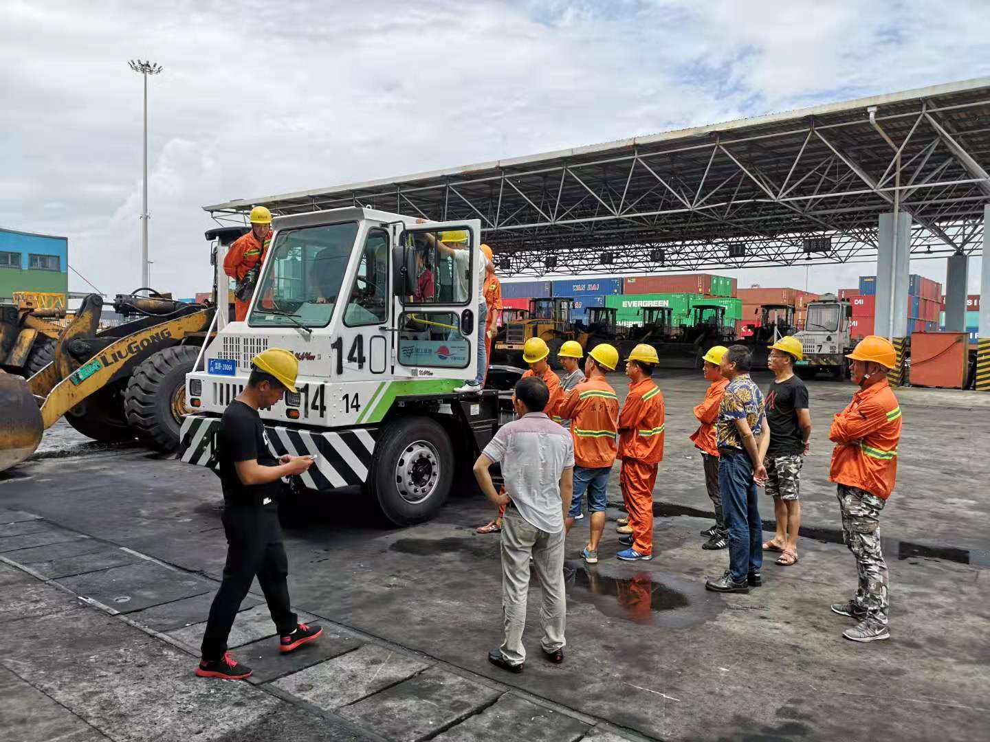 今日,藍(lán)天白云,天氣格外的好。我公司外派的技術(shù)工程師一行三人,已于兩日前赴溫州港集團(tuán)狀元岙港務(wù)公司現(xiàn)場技術(shù)培訓(xùn)。現(xiàn)場效果反饋很好。今日又迎來艾利遜變速箱、曼發(fā)動(dòng)機(jī)公司工程師共做技術(shù)上進(jìn)一步的指導(dǎo),并于下午完成培訓(xùn)。培訓(xùn)結(jié)束后,港區(qū)領(lǐng)導(dǎo)及駕駛員現(xiàn)場試車,對本公司碼頭低速偏置牽引車贊不絕口,并表示:這是科技產(chǎn)品,值得青睞!